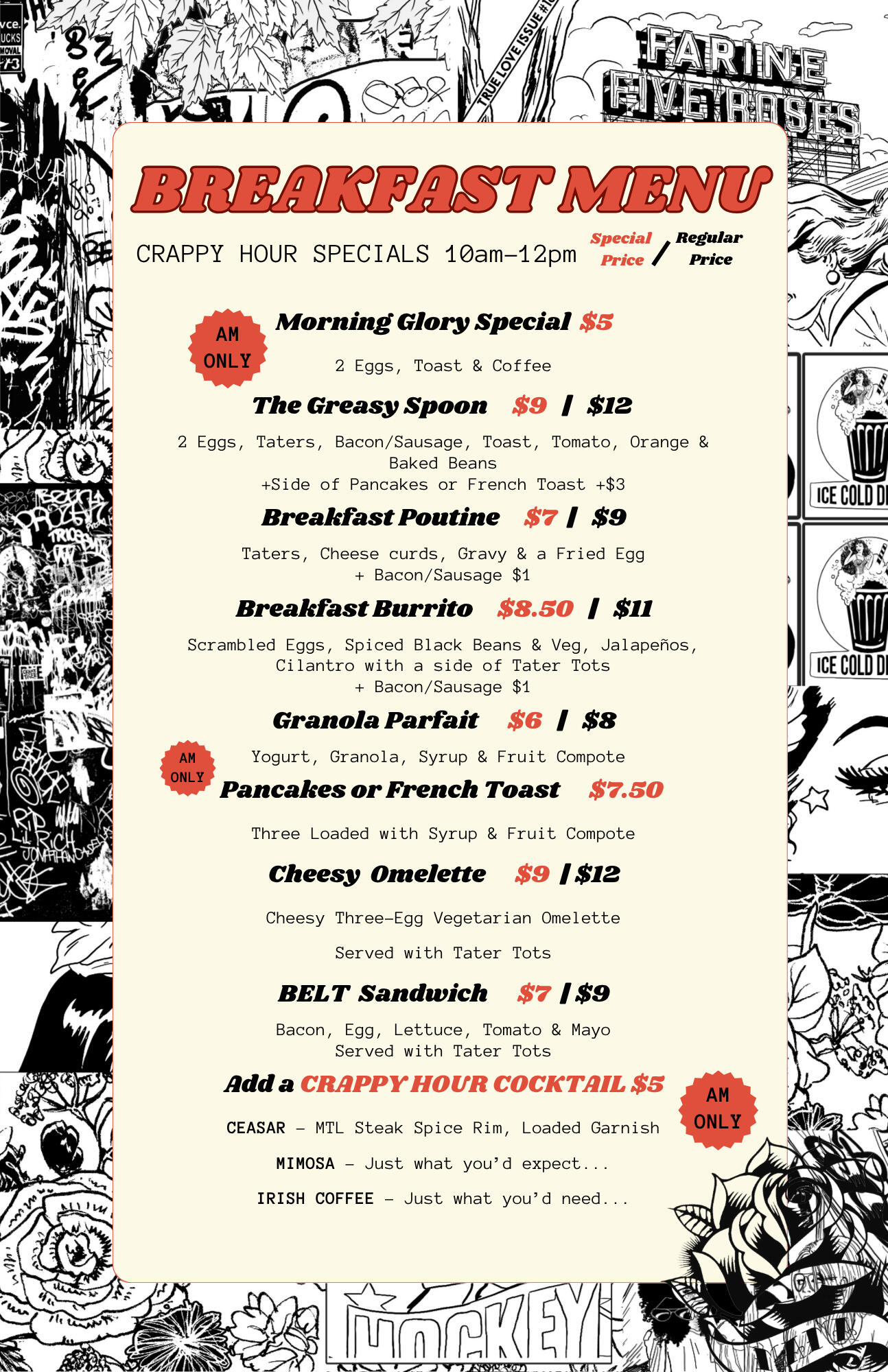 Crappy Hour Specials : 10AM - 12PM See our new menu below!